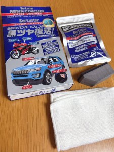 このようにして付属のスポンジでリジンコーティングを黒樹脂部分に塗布していき付属のクロスで拭きあげていくだけ!